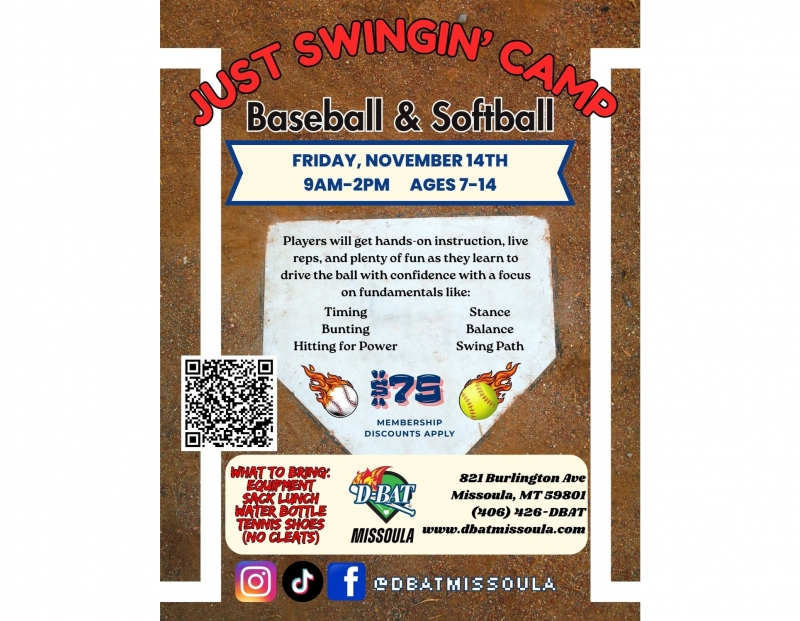 Join us at D-BAT Missoula for our Just Swingin' Baseball and Softball Camp, where players of all skill levels can sharpen their game in a fun, focused environment! This comprehensive camp covers hitting, fielding, pitching, game fundamentals, base-running, mentality and more. Led by experienced instructors and coaches, athletes will receive hands-on instruction, skill-building drills, and personalized feedback. Whether you're looking to build a strong foundation or take your game to the next level, D-BAT’s Just Swingin' Baseball and Softball Camp is the place to be!