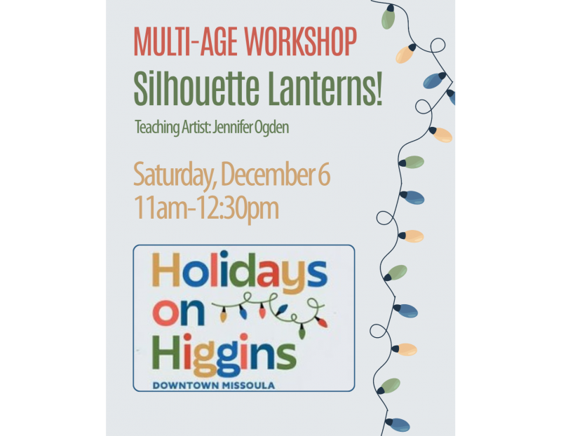 Join teaching artist Jennifer Ogden to build silhouette lanterns for the time of year when we so miss the light! Connect these silhouette lanterns to sticks and carry them in downtown Missoula's Holidays on Higgins that same evening. Gather your friends or loved ones and prepare your creative light! Please join us!